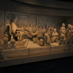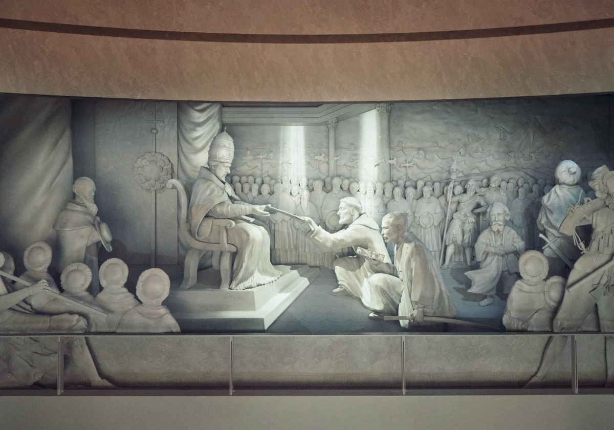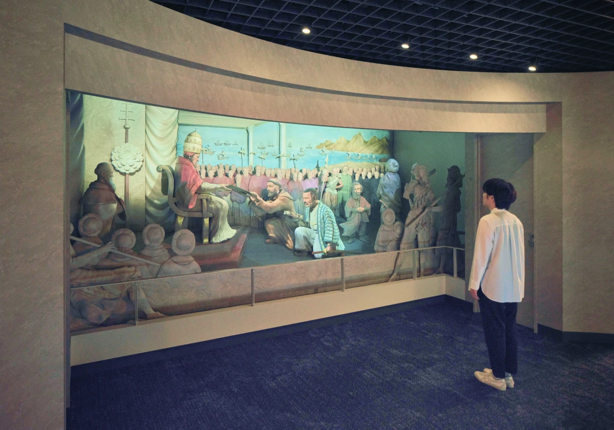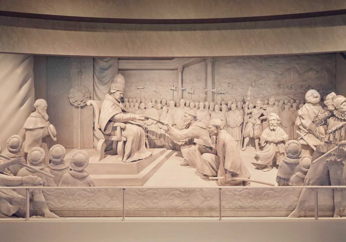 支倉常長とローマ教皇との謁見の様子を、精巧で立体的な「浮き彫り細工」で再現。色鮮やかな映像を照らすことにより、当時の華やかな雰囲気が演出されています。