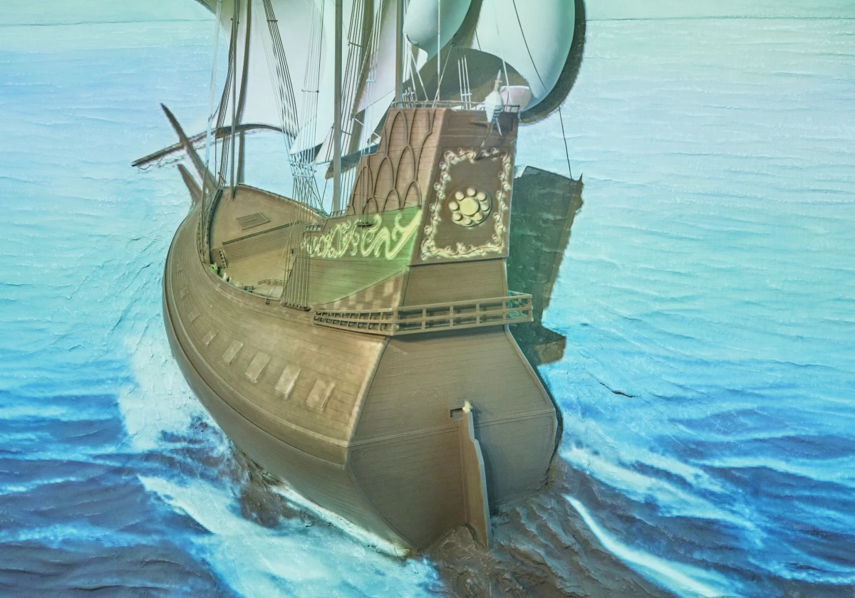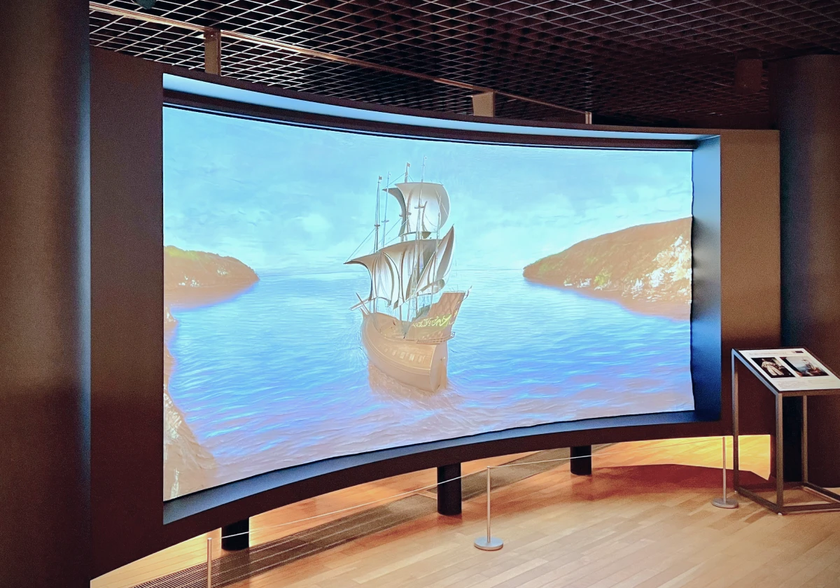 現在の石巻市月浦からの出帆を再現した臨場感ある映像。 支倉常長とともに、未知なる大海原へ。ここから、時を超える冒険の始まりです。