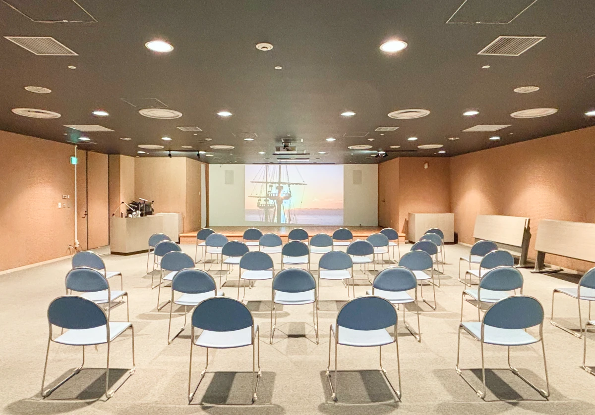 大人数収容可能な多目的ルームです。スタッフによる歴史解説や映像上映のほか、教室や研修会場としてもご活用いただけます。(マイク・プロジェクター貸出可)