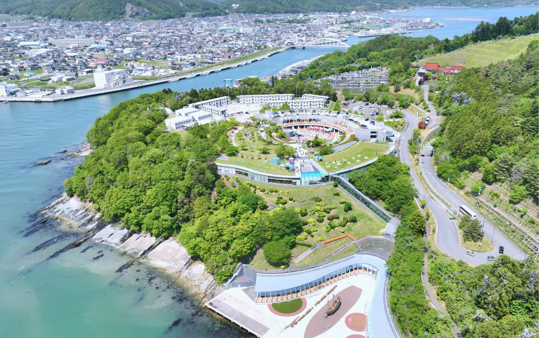 牡鹿半島と太平洋を一望できる景勝地の高台にあり、イタリア風庭園の石巻市サン・ファンバウティスタパークに囲まれています。 施設は地図上の等高線をデザイン化、自然と共生型の展望棟とドック棟が丘陵地に組み込まれる形で設計され、1996(平成8)年に開館しました。