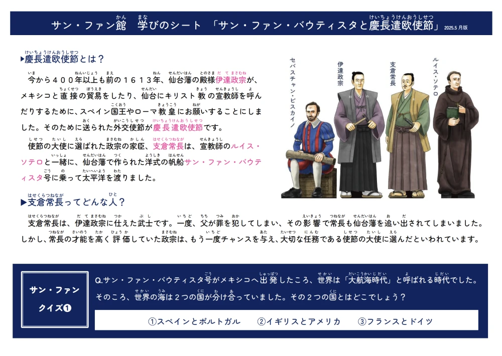 当館オリジナルの「サン・ファン館 学びのシート」は、事前学習だけでなく、振り返り学習でもお使いいただけるよう作成しています。